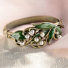 A sculptured bracket of art nouveau style lilies-of-the-valley and joining leaves span across a split shank oval hinged bracelet.