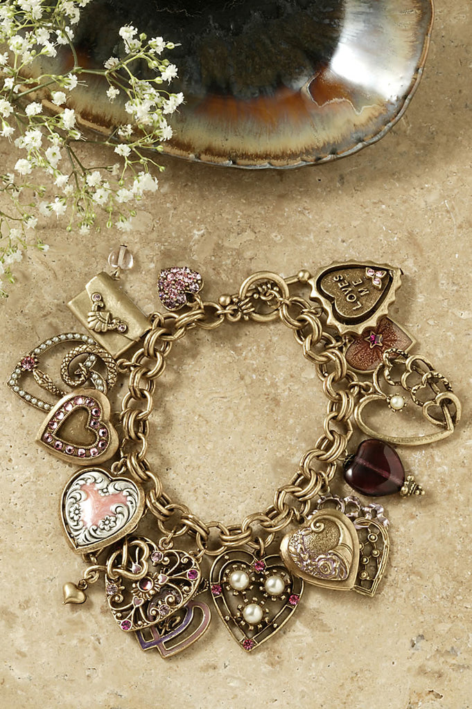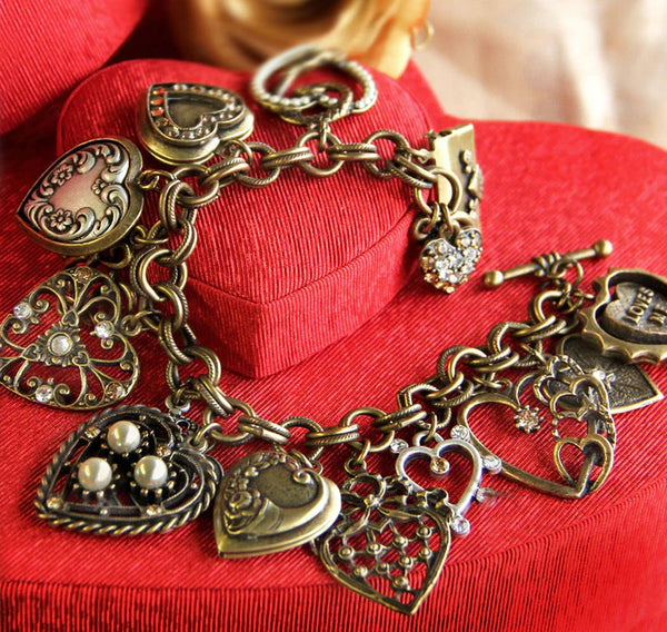 If there is a fashion symbol for the carefree, future-minded era of the 1940s and 50s, it’s the charm bracelet. Poodle-skirted bobbysoxers, fashion sophisticates, our aunts and sisters all wore charm bracelets. Whether collected one-by-one or purchased ready-made, the heart charm was everyone’s favorite. Our bracelet is filled with love from many eras-the Victorian serpent and love letter to the spinning heart and the lockets of the 50s.